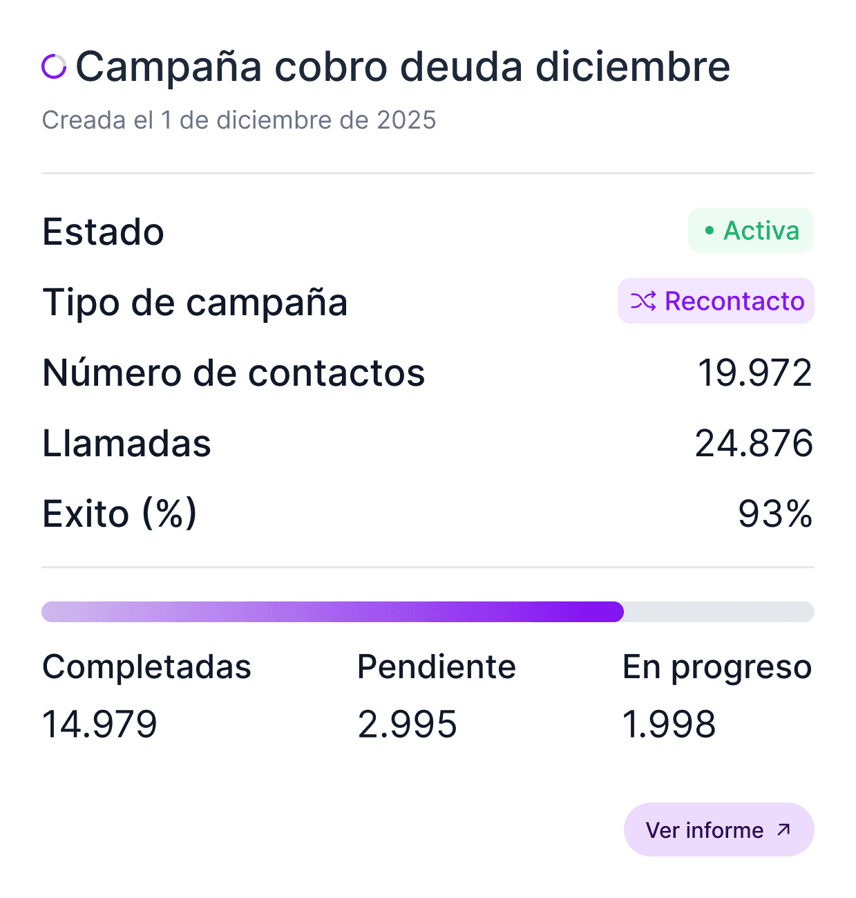 Las campañas multivariantes te permiten probar diferentes configuraciones, desde el tono de voz del agente hasta los horarios y los guiones, y medir qué combinación genera los mejores resultados.